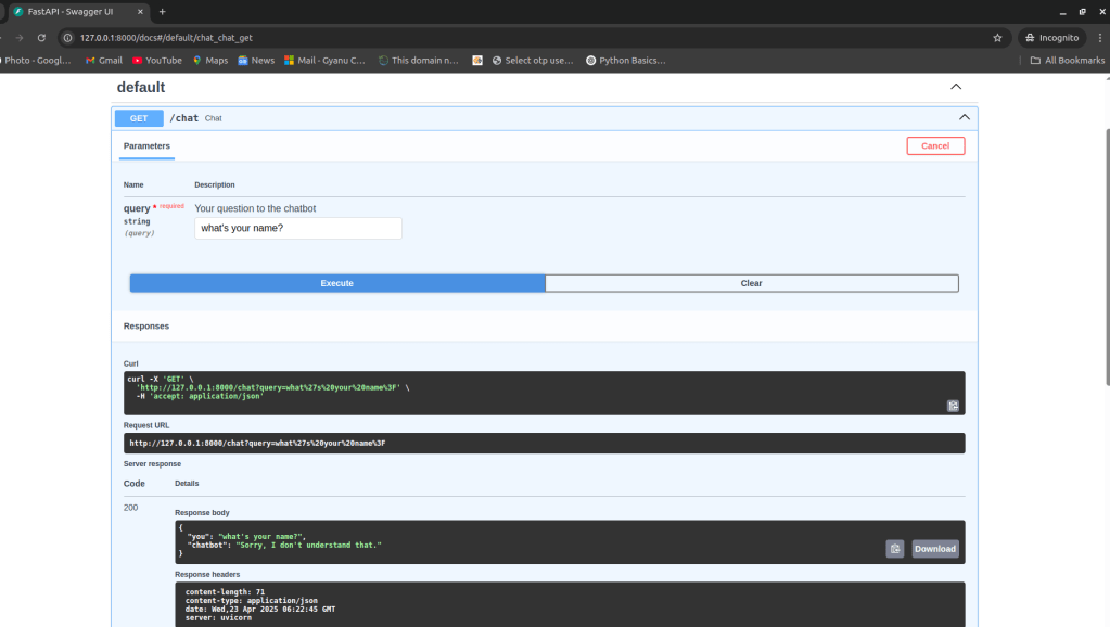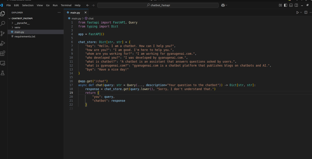 And there you go – you’ve just created your very first chatbot using FastAPI! This project is great for beginners who want to learn API development, and it’s a solid foundation to build more advanced AI applications in the future.
